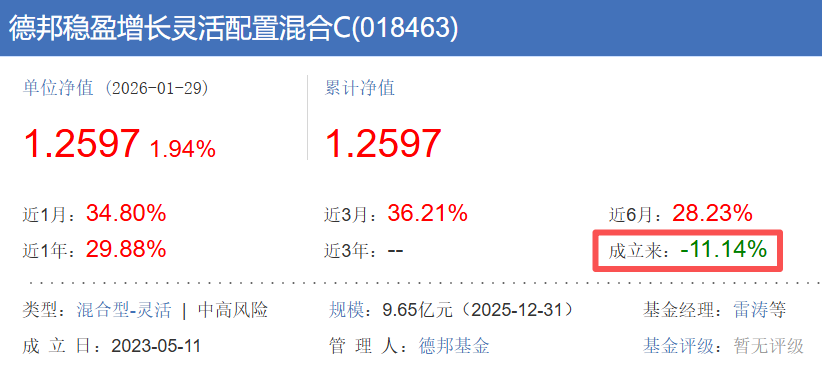 截至2026年1月14日,德邦稳盈增长A、C类份额年内涨幅均超过30%,其中1月9日单日净值暴涨9.24%。