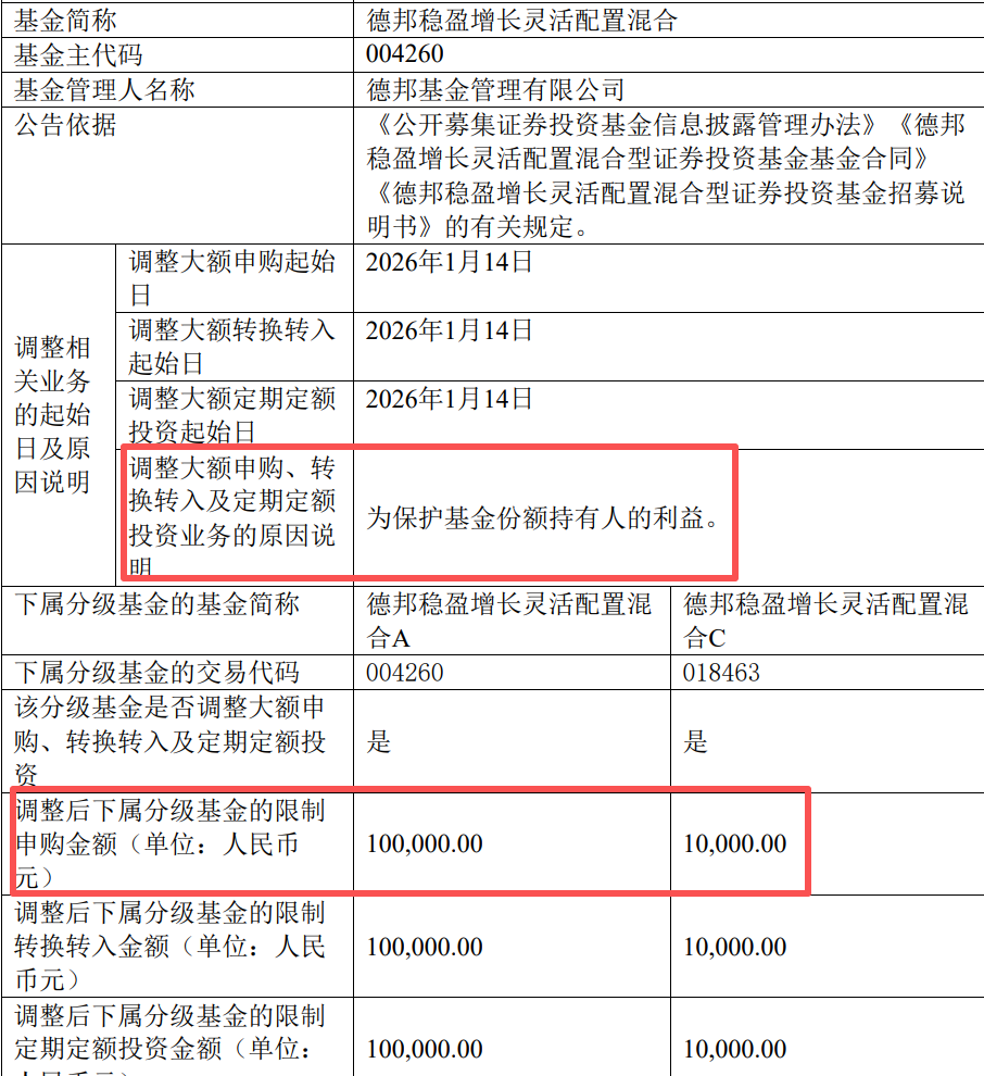 1月13日,德邦基金火速发布限购公告,将申购上限设为A类1000万元、C类100万元。