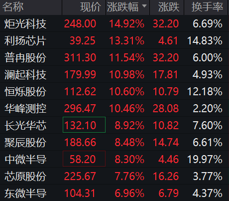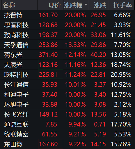 炬光科技、 利杨芯片、澜起科技、太辰光等多股涨超10%。