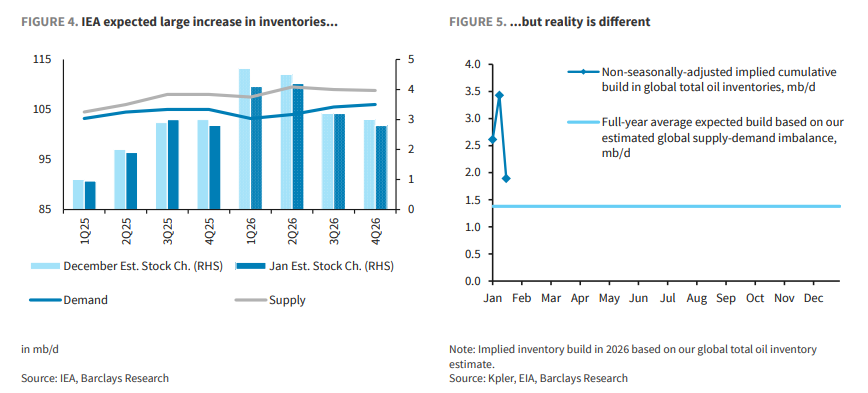 过去一年,市场反复引用 IEA、EIA 的供需预测,认为 2026 年全球原油市场将出现00–400 万桶/日的供给过剩。但巴克莱强调,如果过剩真实存在,应当首先反映在库存之中。