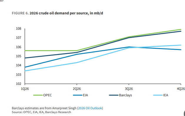 巴克莱指出,市场并非在“算错供给”,而是在系统性低估需求的绝对水平。不同机构对2026年原油需求的“起点”本身,差异就高达200万桶/日以上。所谓“缺失的桶”,并没有消失,而是被统计口径和数据滞后掩盖了。