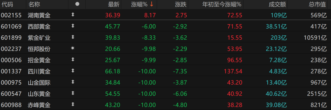 聚焦到黄金产业链个股,湖南黄金在一片跌势中强势上涨,午间收盘涨幅达8.17%,成交额高达109亿元,创下其上市以来新高。
