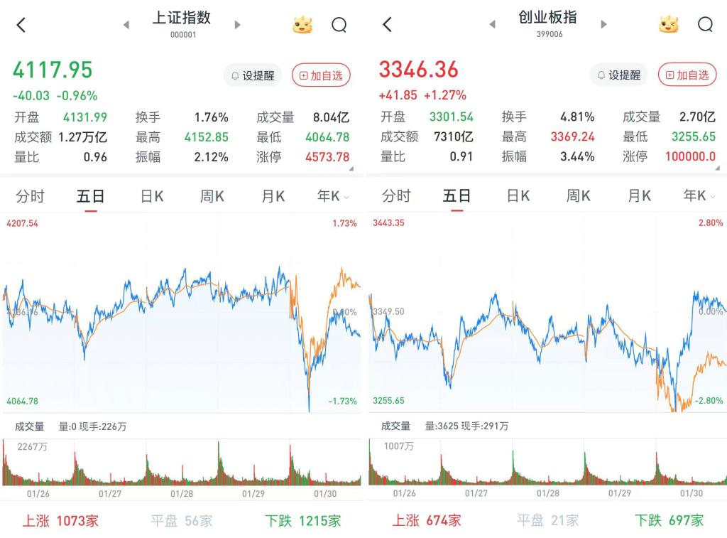 A股三大股指1月30日集体低开。贵金属大幅下挫,导致沪深股指表现低迷,而创指在半导体走强带动下表现强劲。