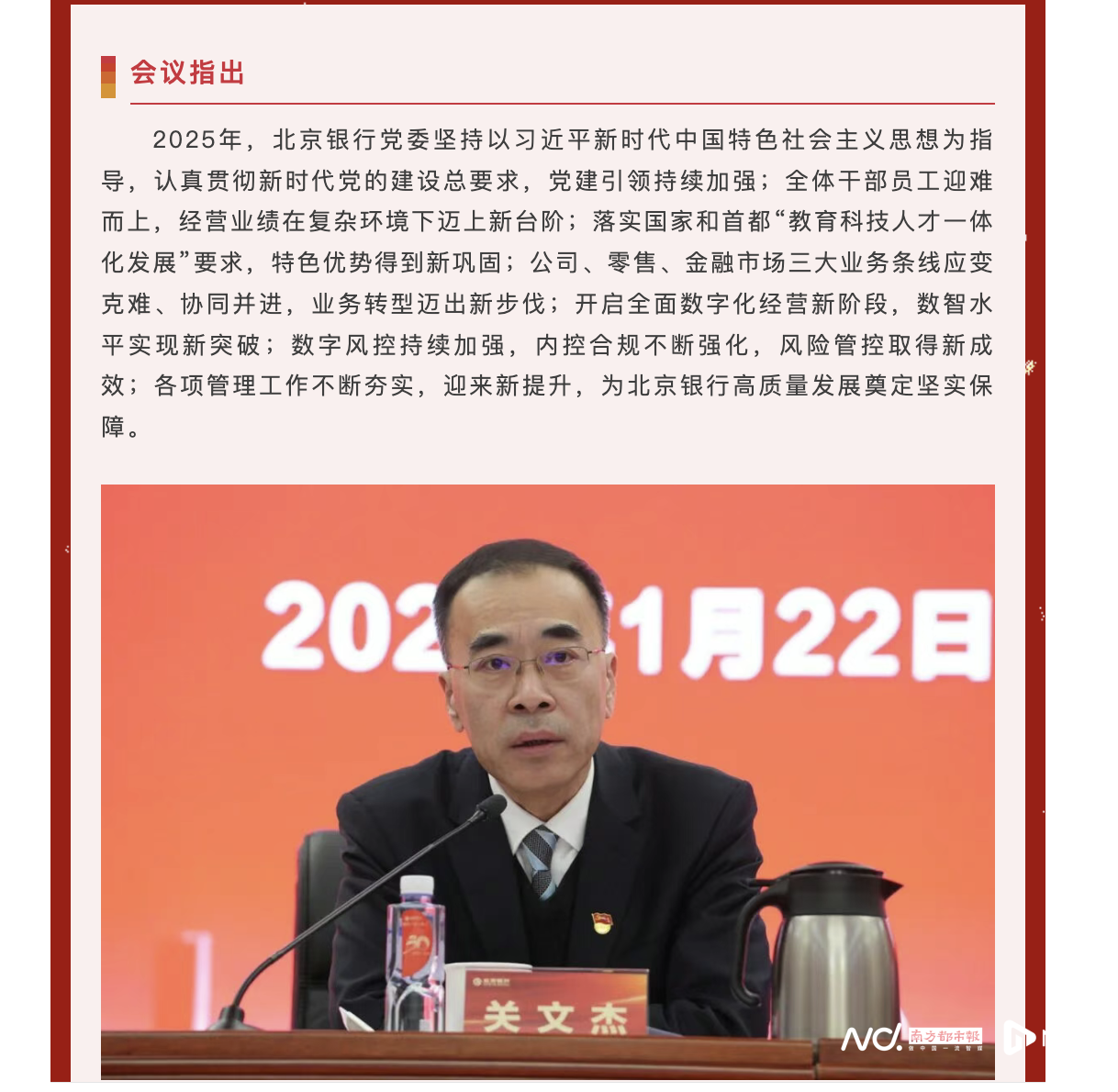 南都·湾财社记者对时间线进行梳理发现,此次人事调整节奏紧凑。1月20日,业内传出消息,关文杰已正式被任命为北京银行党委书记;仅两天后的1月22日晚间,北京银行官方微信发布2026年工作会议相关信息。推文显示,党委书记关文杰发表讲话,党委副书记、行长戴炜作工作报告。