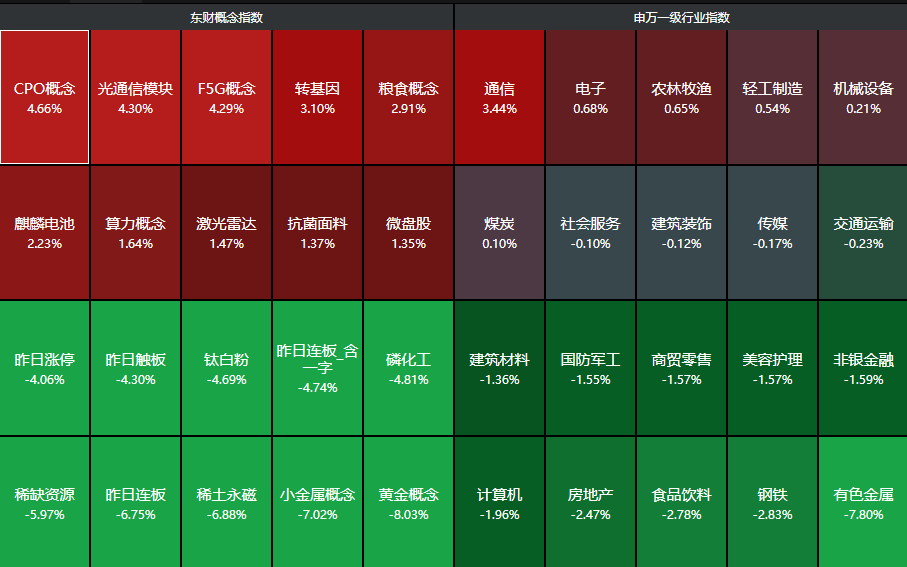分行业来看,通信、电子、农林牧渔、轻工制造、机械设备等行业领涨,有色金属、钢铁、食品饮料等行业领跌。