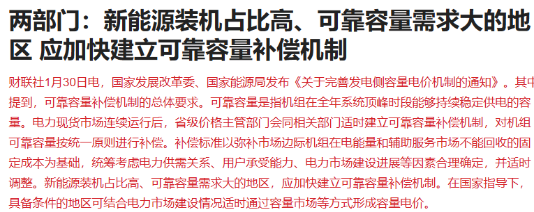 国家发展改革委、国家能源局发布《关于完善发电侧容量电价机制的通知》。其中提到,可靠容量补偿机制的总体要求。