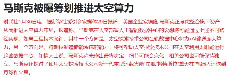 据新华社援引多家媒体29日报道,美国企业家埃隆·马斯克正考虑整合旗下资产,从而推进太空算力布局。
