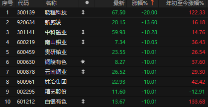 今天有色金属板块掀起跌停潮,晓程科技、南山铝业、铜陵有色、云南铜业等数十只个股跌停。