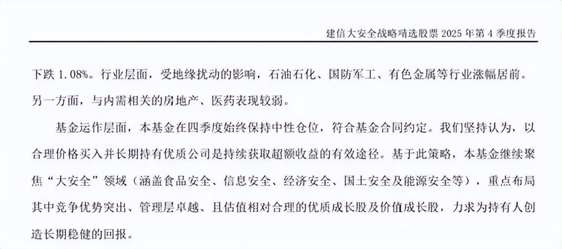 建信大安全战略精选。定期报告显示,它在2024年底和2025年底的投资策略和运作分析内容几乎一样。,继续聚焦“大安全”(食品安全、信息安全、经济安全、国土安全、能源安全等)。24年底和25年底对比,基本只是把几个安全的排序调换了。