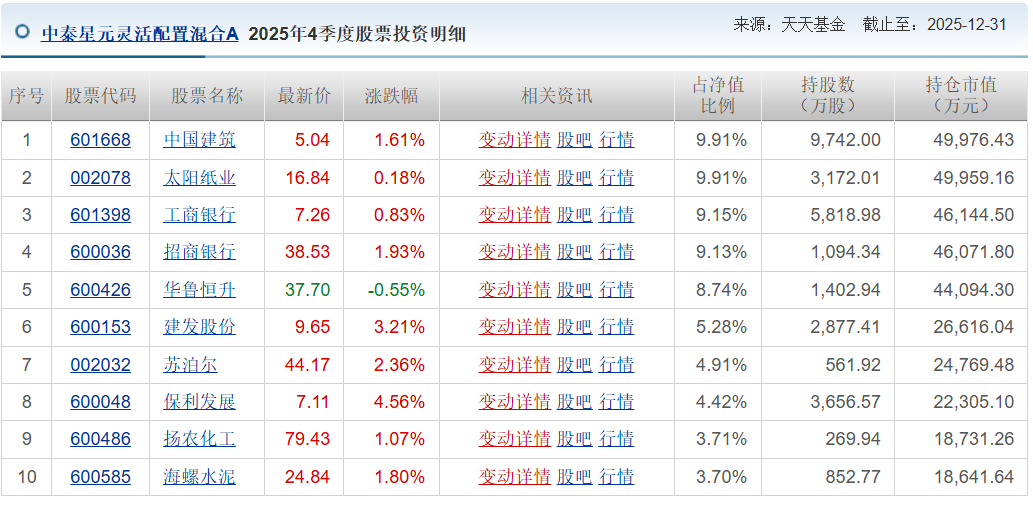 最典型的案例,就是姜诚的两只“经典躺平产品”:中泰星元和中泰玉衡价值优选。最新规模分别超过50亿元和15亿元。这两只基金在2024年底和2025年底的十大重仓股都没有变过。