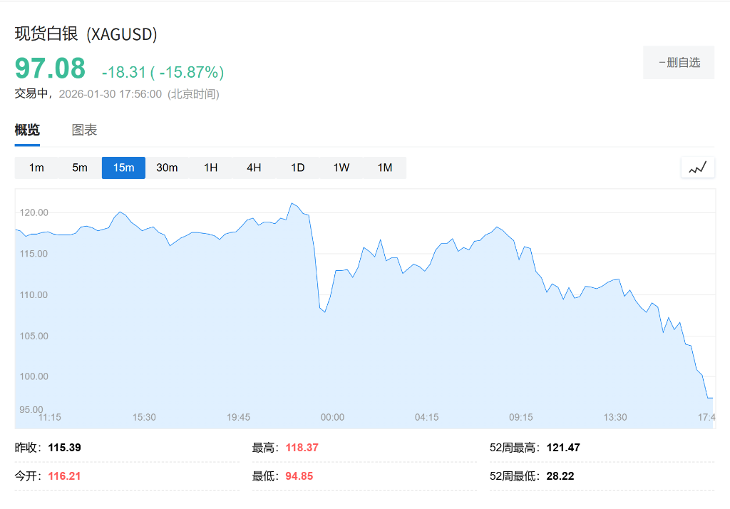 受美联储人事变动预期及获利回吐压力影响,贵金属市场周五遭遇剧烈抛售,金银价格从历史高位大幅回落,结束了此前势不可挡的连创纪录行情。这一突发性逆转表明,在经历了“融涨”式的单边上行后,市场对货币政策边际变化的敏感度正显著提升。