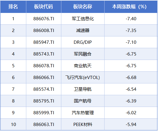 本周排在跌幅榜前排的概念板块分别是军工信息化、减速器、DRG/DIP、军民融合、商业航天,累计跌幅分别为7.4%、7.35%、7.1%、6.75%、6.75%。
