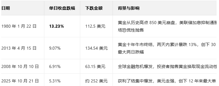 要知道自1980年以来,现货黄金的单日最大跌幅记录,是13.23%,当时的背景是由于美联储加息,市场出现恐慌性抛售。