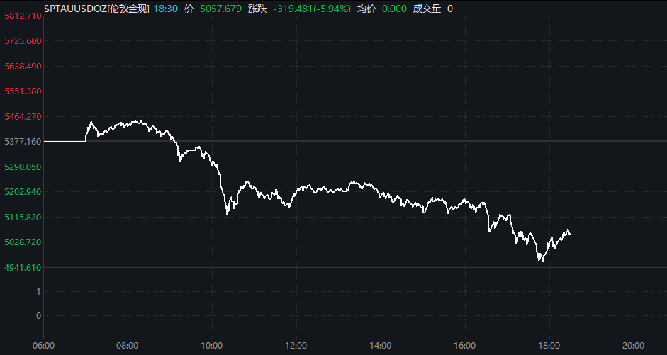 现货黄金盘中一度跌超8%,跌破5000美元/盎司关口。