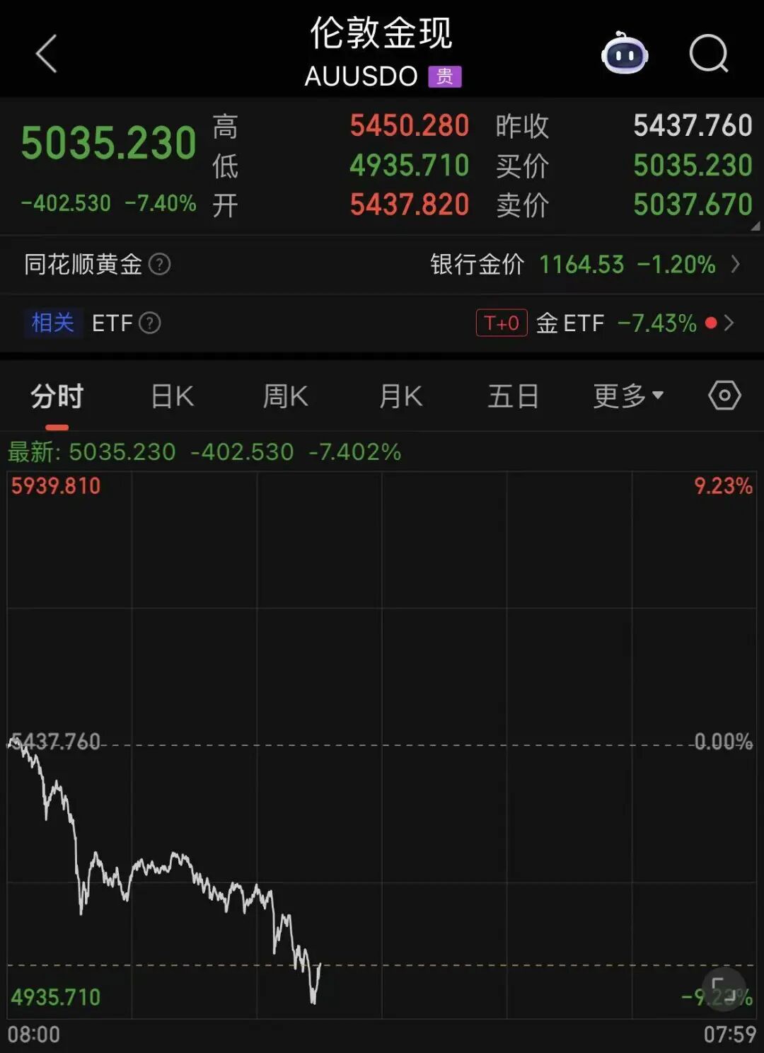截止发稿,现货黄金的跌幅有所收窄,但仍然跌超5%。