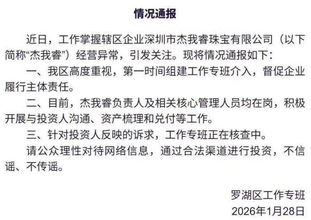 深圳市罗湖区在杰我睿公司经营异常引发关注后,组建工作专班介入,1月28日罗湖区工作专班发布情况通报称,“第一时间组建工作专班介入,督促企业落实主体责任;目前杰我睿负责人及相关核心管理人员均在岗,积极开展与投资人沟通、资产梳理和兑付等工作。”