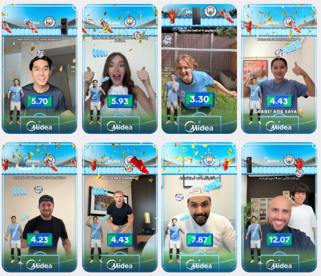 其次首创了“球星同框AR滤镜”玩法,让用户可在AR滤镜中实现与三位球星“同框传球”互动。让用户从被动观看,成为与球星并肩作战的参与者。此外还设计了“球星传球-用户接球-击中家电”的完整互动故事,搭配“Midea GO”的行动指令音效,不仅让互动更有趣,还顺带解决了全球用户对“Midea”(美的英文名称)品牌发音的认知问题。