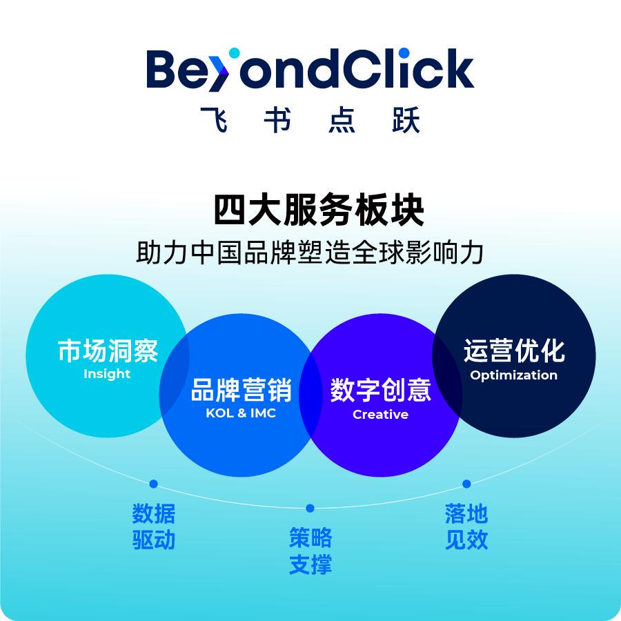飞书点跃BeyondClick是飞书深诺集团旗下专注于电商与品牌出海的专业营销服务子品牌,面向中国企业提供 “数据驱动、策略支撑、落地见效” 的全球化营销解决方案。依托深度行业洞察、全链路营销能力与跨区域运营经验,帮助品牌高效触达海外市场与消费者,塑造全球影响力。