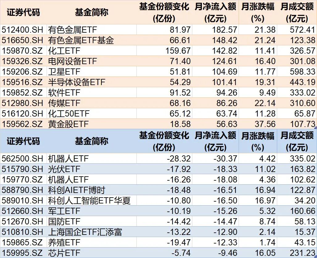 行业主题上看,有色、化工等相关ETF被资金看好,而机器人、光伏相关ETF被资金抛售。