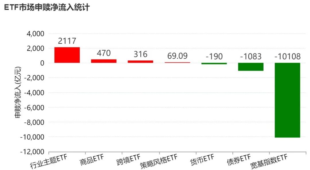 Wind数据显示,本月沪深两市股票型ETF和跨境型ETF合计净流出7606亿元,宽基指数ETF净流出10108亿元,而行业主题ETF净流入2117亿元。