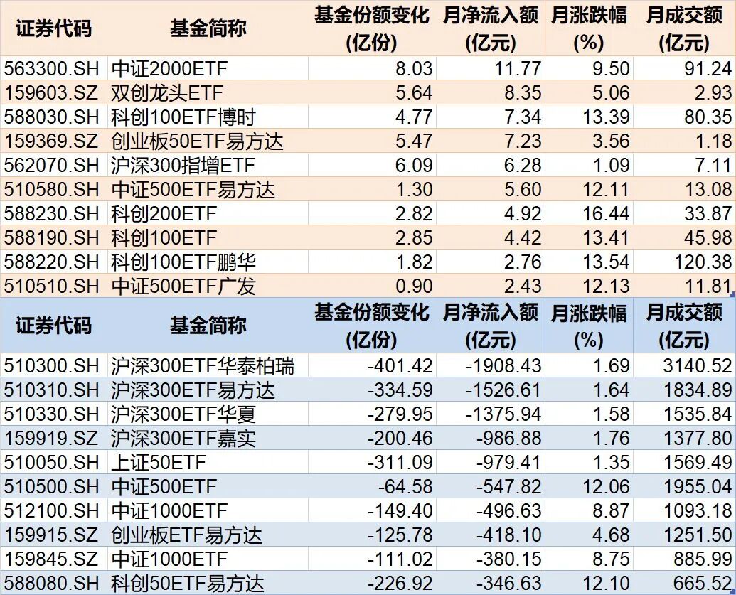主要宽基指数整体资金申赎统计显示,本月沪深300净流出5818亿元,仅中证2000实现净流入。