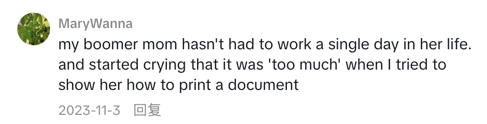 “我的婴儿潮母亲这辈子从未工作过一天,然而当我教她怎么打印文件的时候,她却哭了起来。”