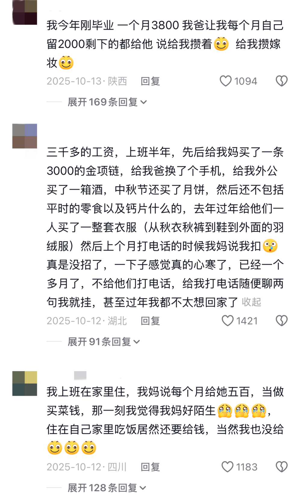 小时候几块几块的给,长大后几千几千的要。这一系列的精华,都浓缩在评论区天南海北的诉苦。