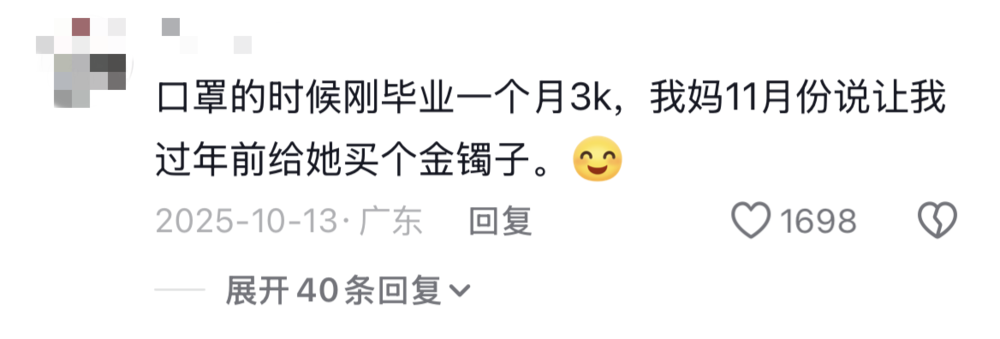 “高中的时候,冬天来了冻死了,买了一件300的棉袄,我妈从街头说到街尾,从70年代她多苦说到现在要努力学习回报她。我穿了一件300的棉袄却要替她背负了40多年的痛苦。那是我这辈子穿过最冻心的衣服。”