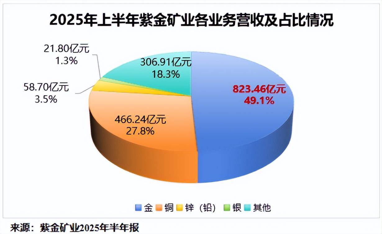 从营收结构来看,2025年上半年,公司的黄金业务总营收达823.46亿元,占总营收的49.1%,已超越铜业务成为公司第一大收入支柱。