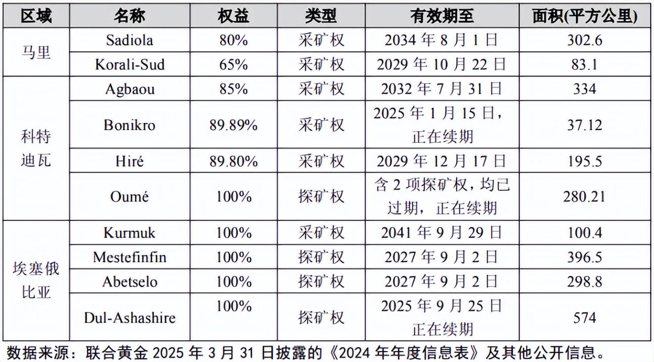 目前,联合黄金在马里、科特迪瓦及埃塞俄比亚三国总计持有6项采矿权及5项探矿权。