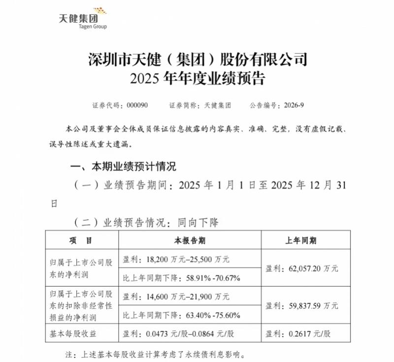 1月31日,深圳国资控股上市公司天健集团(000090.SZ)披露2025年年度业绩预告,公司业绩再度遭遇大幅下滑。公告显示,天健集团2025年预计实现归母净利润1.82亿元至2.55亿元,较上年同期的6.21亿元同比下降58.91%至70.67%;扣除非经常性损益后的归母净利润为1.46亿元至2.19亿元,同比降幅进一步扩大至63.40%至75.60%,业绩表现创下近年新低。