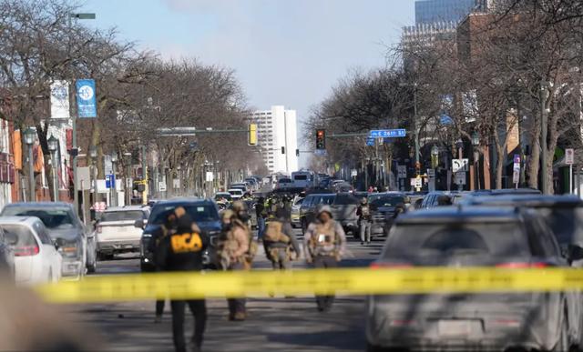 24日,明尼阿波利斯街头,联邦执法人员封锁了枪击现场。图源:央视新闻