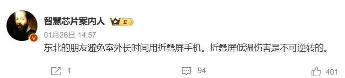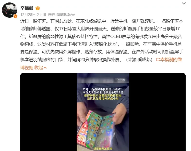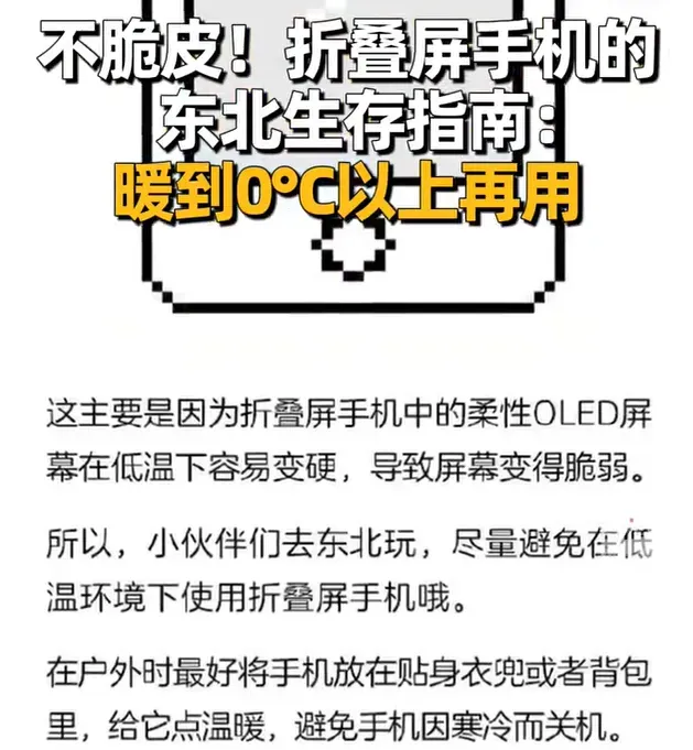 大家渐渐发现,在冰天雪地里掏出折叠屏居然成了一件需要心理建设的事情,你得先判断一下气温是否已经击穿了说明书上的建议区间,还要观察转轴处有没有因为呼出的热气结成细小的冰霜,“比伺候我那瘫痪在床的二舅姥爷,还得细心。”