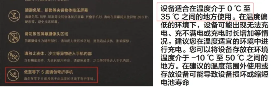 几乎所有主流折叠屏的说明书里,推荐使用温度都缩在一个极其保守的区间,通常标注为0℃到35℃之间。