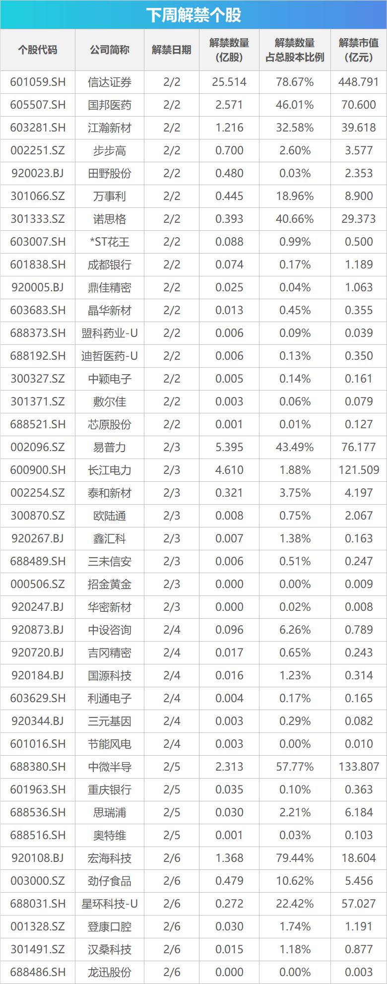 从解禁市值来看,2月2日是解禁高峰期,18家公司解禁市值合计607.1亿元,占下周解禁规模的58.56%。按1月30日收盘价计算,解禁市值居前三位的是:信达证券(448.79亿元)、中微半导(133.81亿元)、长江电力(121.51亿元)。从个股的解禁量看,解禁股数居前三位的是:信达证券(25.51亿股)、易普力(5.39亿股)、长江电力(4.61亿股)。