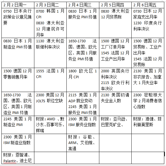 下周还有多项美国经济健康状况的核心指标公布,1月供应管理协会制造业采购经理人指数(PMI)将于周一发布,非制造业采购经理人指数(PMI)紧随其后于周三公布;2月密歇根大学消费者信心指数初值则在周五揭晓。此外,美国财政部季度再融资公告也将于周三发布。