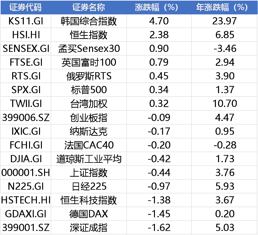 本周全球股市多数下跌,由于三星、海力士强劲表现,韩国综合指数单周大涨4.7%依旧领涨,恒生指数上涨2.38%,A股三大指数均下跌。