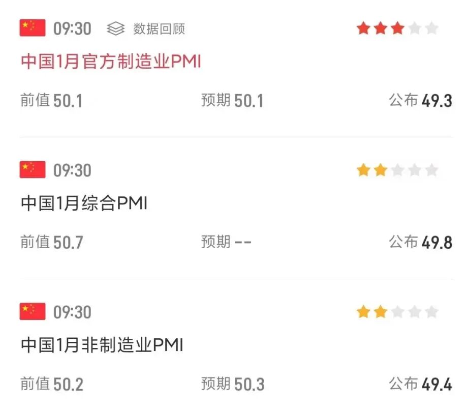 2. 中国1月官方制造业PMI为49.3%,环比下降0.8个百分点,低于预期的50.1%;非制造业PMI为49.4%,下降0.8个百分点,低于预期50.3%;综合PMI产出指数为49.8%,下降0.9个百分点。