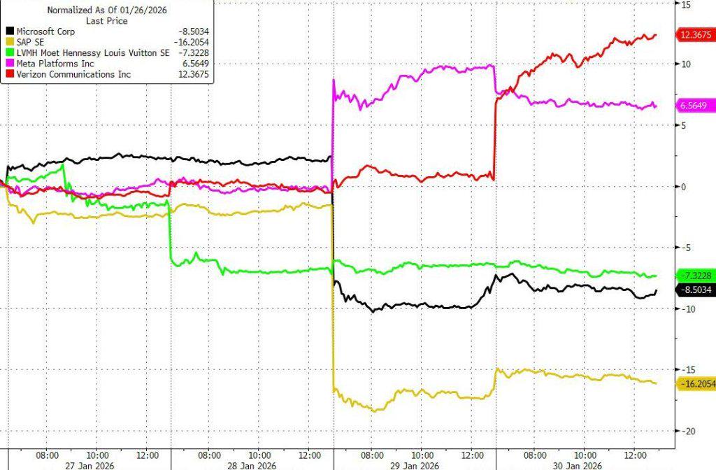 市场本周的波动幅度令人瞠目。微软单日下跌10%,遭遇史上第二大市值损失,但同时创下有史以来最高的名义成交额。SAP暴跌16%,同样伴随创纪录的交易量。涨幅方面同样惊人,Meta上涨10%,Verizon飙升11%。