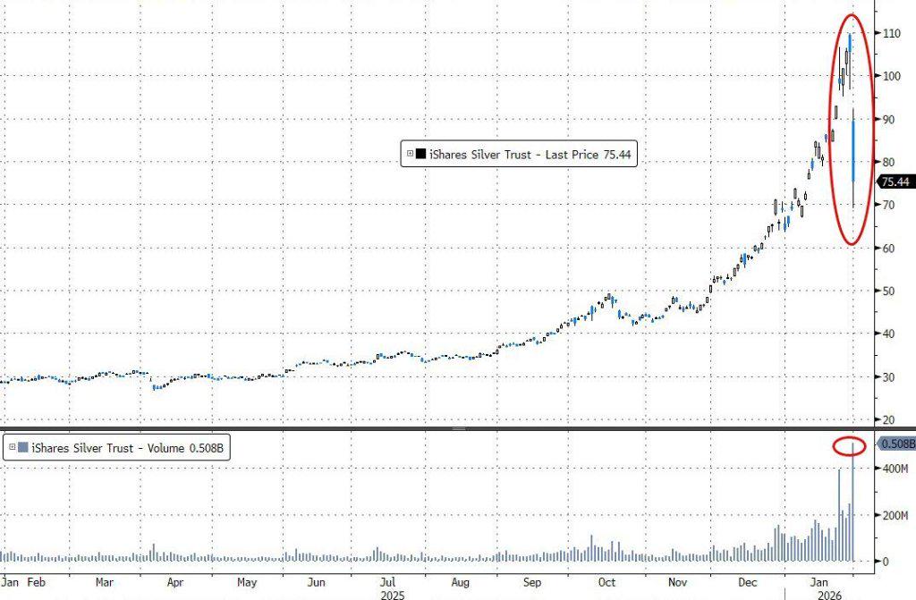 市场本周创下多项极端纪录。微软遭遇史上第二大单日市值损失,SAP暴跌16%,白银单日重挫30%。白银ETF SLV的名义交易量超过320亿美元,黄金ETF GLD连续两个交易日成交额超过300亿美元。白银波动率飙升至仅在全球金融危机和新冠疫情封锁期间出现过的极端水平。
