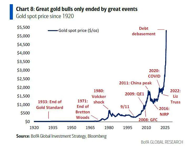 尽管黄金价格近期呈现出“泡沫化”特征,甚至在上周五经历了大幅回调,但Hartnett认为这并未改变大局。