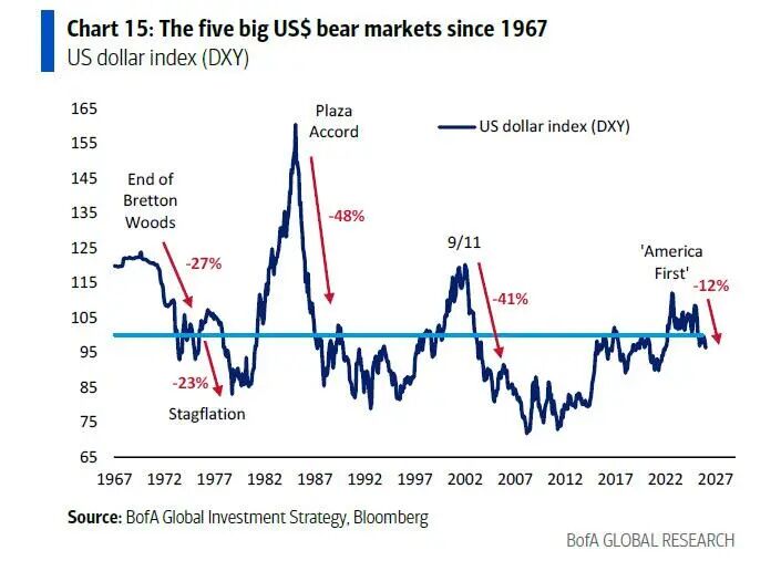 尽管周五美元汇率出现了反弹,但Hartnett指出,自特朗普就职以来,美元实际上已经下跌了12%。这种疲软并非偶然,而是一种政策导向。