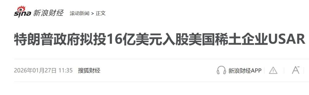 2026年1月27日又有了最新的收购,特朗普建议美国考虑 16亿美元收购美国稀土公司($USAR)10%股权。这是美国在稀土领域最大的投资。