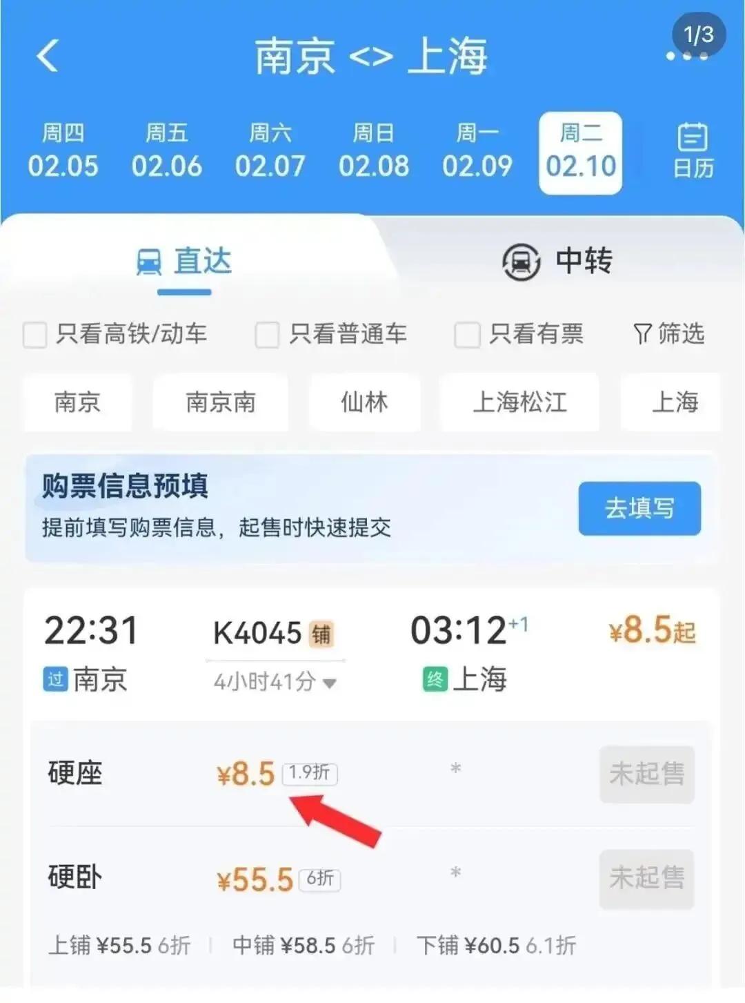 原标题:《“反向春运”火了!部分火车票低至1.9折,南京到上海只要8.5元》