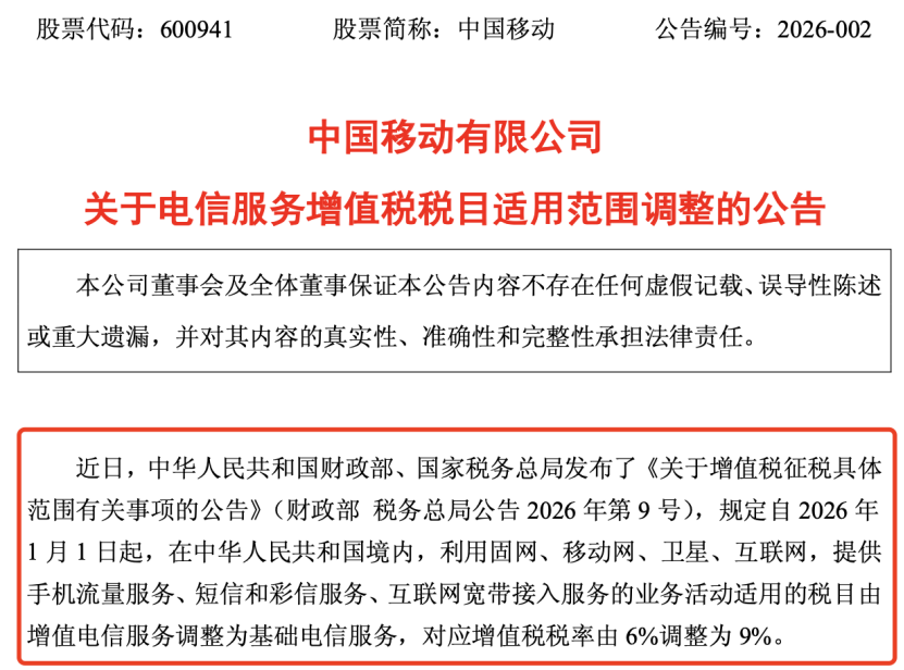 2月1日,中国移动、中国电信、中国联通发布公告称,近日,中华人民共和国财政部、国家税务总局发布了《关于增值税征税具体范围有关事项的公告》(财政部税务总局公告2026年第9号),规定自2026年1月1日起,在中华人民共和国境内,利用固网、移动网、卫星、互联网,提供手机流量服务、短信和彩信服务、互联网宽带接入服务的业务活动适用的税目由增值电信服务调整为基础电信服务,对应增值税税率由6%调整为9%。