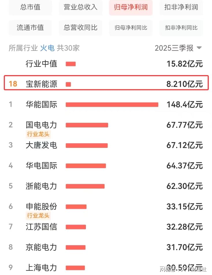 净利润排名中,宝新能源约8亿元的净利润位于第18位,处于中游水平,而头部火电企业凭借庞大业务体量和多元布局占据主导、获取丰厚利润,宝新能源只能努力守住一席之地。