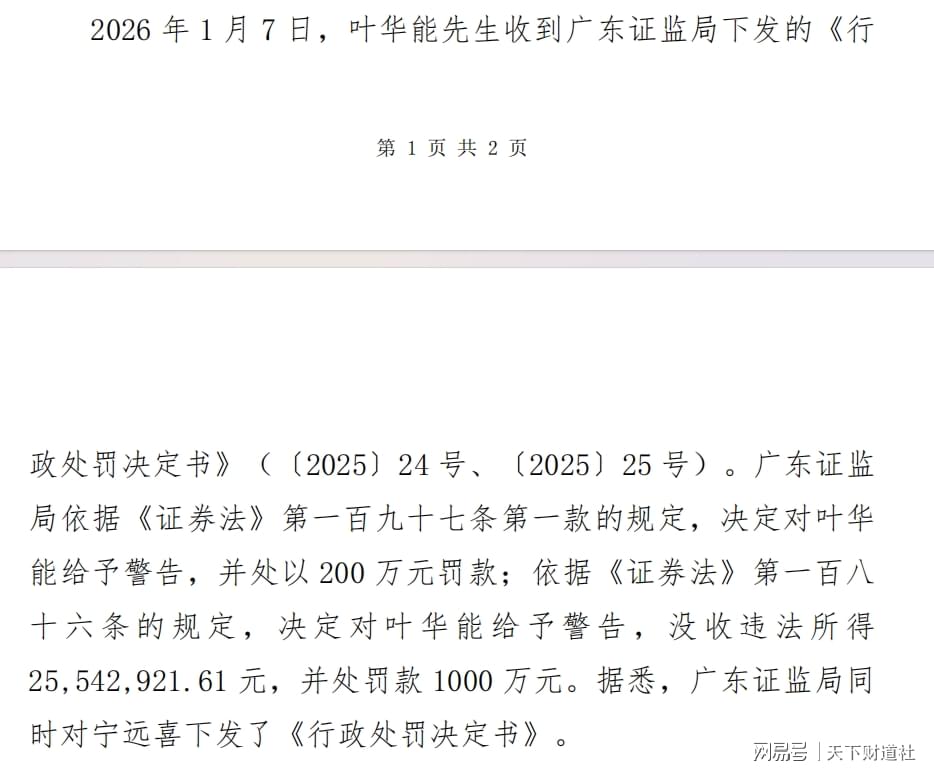 2025年3月,中国证监会因叶华能涉嫌信息披露等违法违规行为进行立案调查。同年12月,广东证监局下发《行政处罚事先告知书》,拟警告并罚款200万元。针对违规减持部分,拟没收违法所得2554万元、罚款1000万元,合计罚没3754万元。