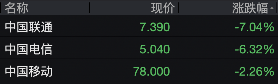 三大通信运营商集体下跌,中国联通跌逾7%,中国电信跌逾6%,中国移动跌超2%。