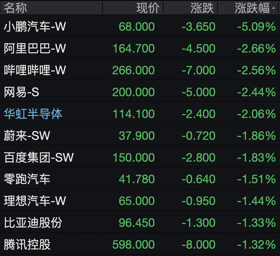 科网股多数走低,小鹏汽车跌逾5%,阿里巴巴、华虹半导体、哔哩哔哩、网易跌逾2%。
