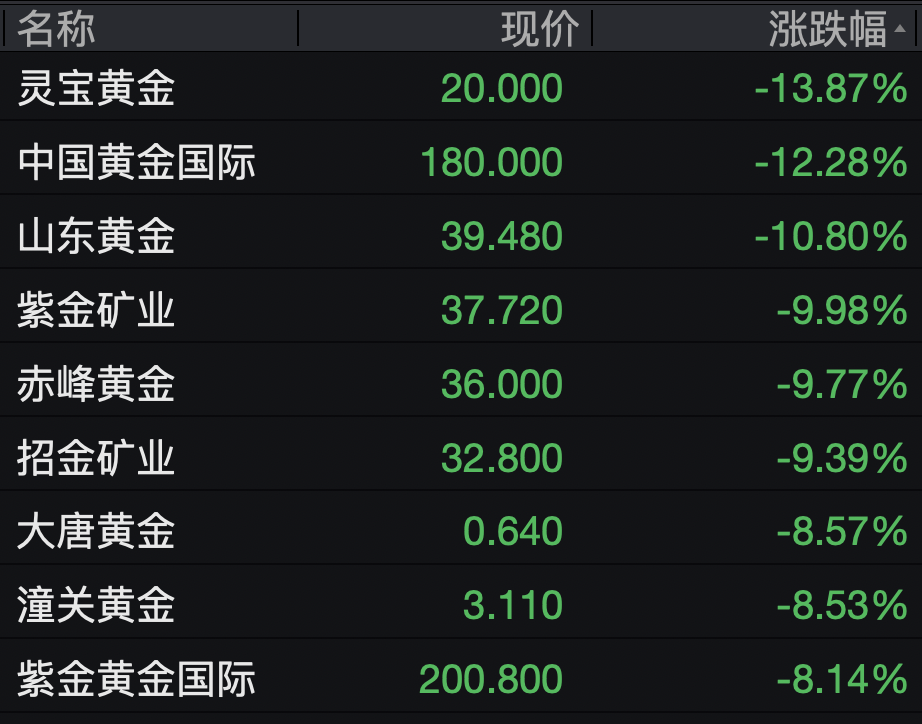 黄金、贵金属板块低开,灵宝黄金跌近14%,中国黄金国际跌超12%,紫金矿业跌近10%,赤峰黄金、招金矿业均跌超9%。